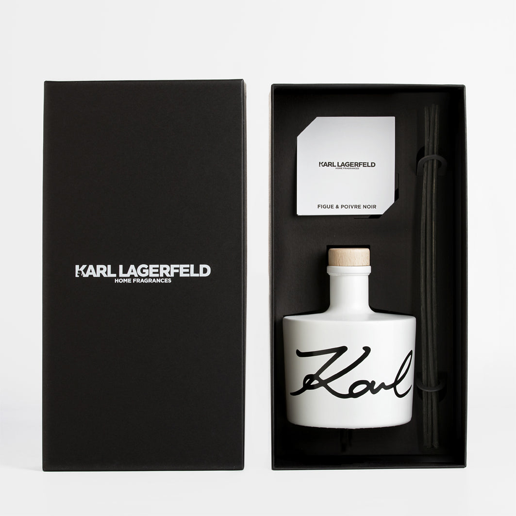 Housed in an elegant white vessel adorned with Karl Lagerfeld’s iconic signature, this reed diffuser not only perfumes your home but adds a touch of timeless style. Ideal for continuous scenting, it creates a serene yet invigorating ambiance perfect for any room.